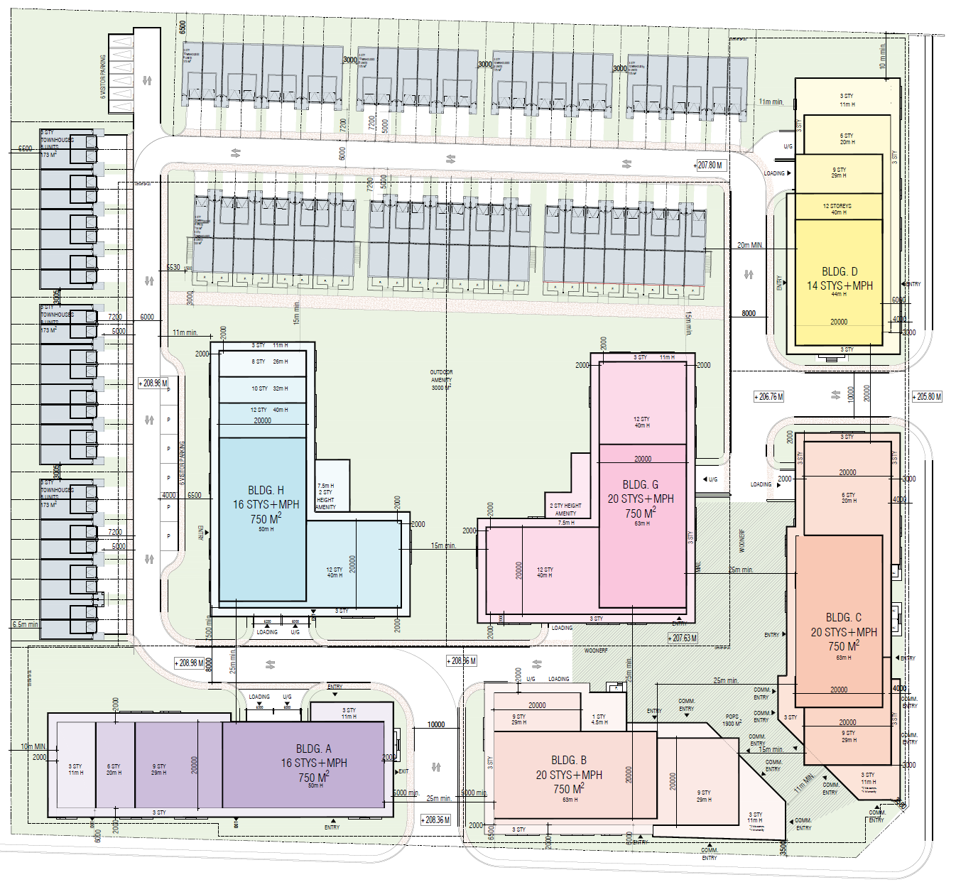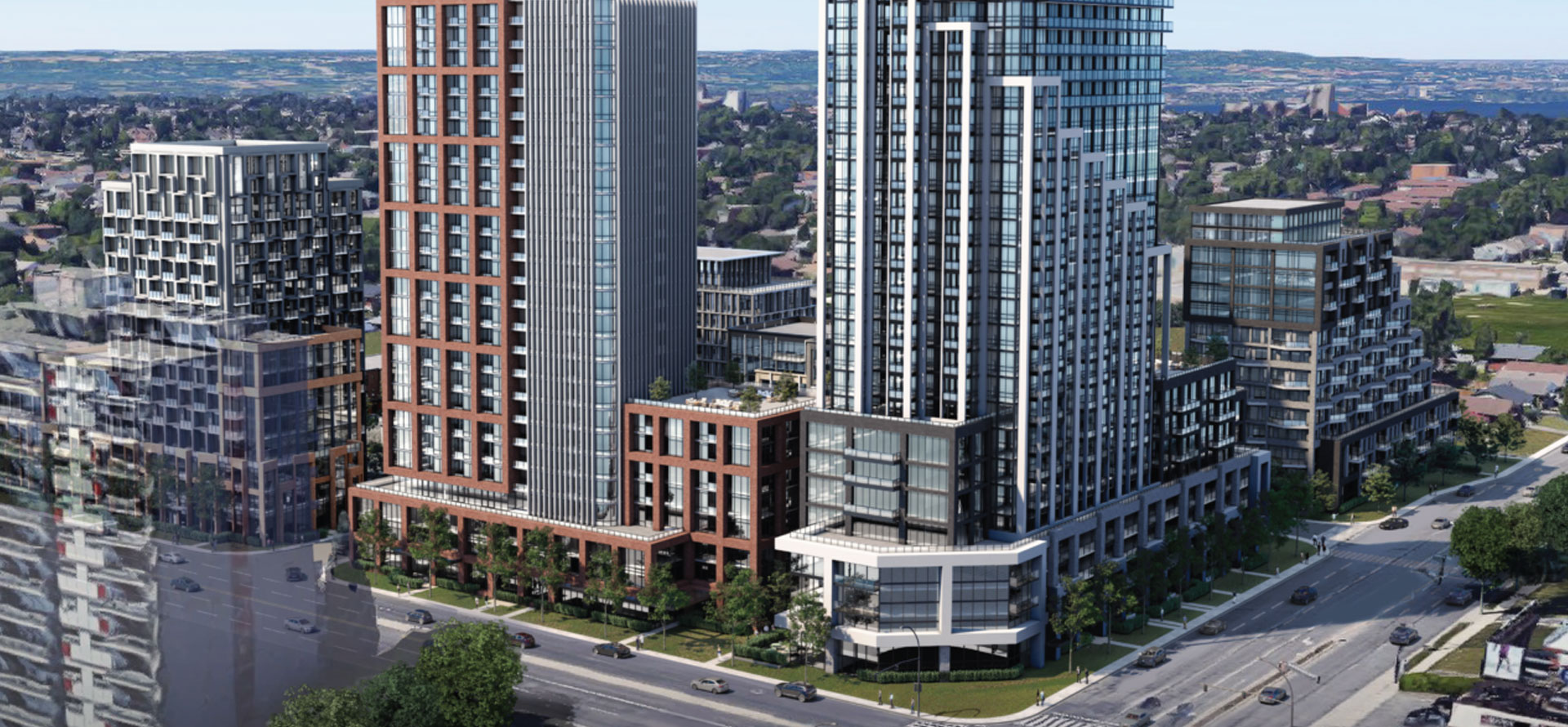 UrbanSolutions secured approval of the Official Plan & Zoning By-law Amendment at the Ontario Land Tribunal for a mix of low-rise, mid-rise and high-rise buildings which include three 20-storey buildings, two 16-storey buildings, one 14-storey building, seven 3-storey townhouse blocks and three 3-storey back-to-back townhouse blocks. The buildings propose a total of 1,850 dwelling units with 1,912 parking spaces and 1,054 square metres (“m2”) of commercial space.