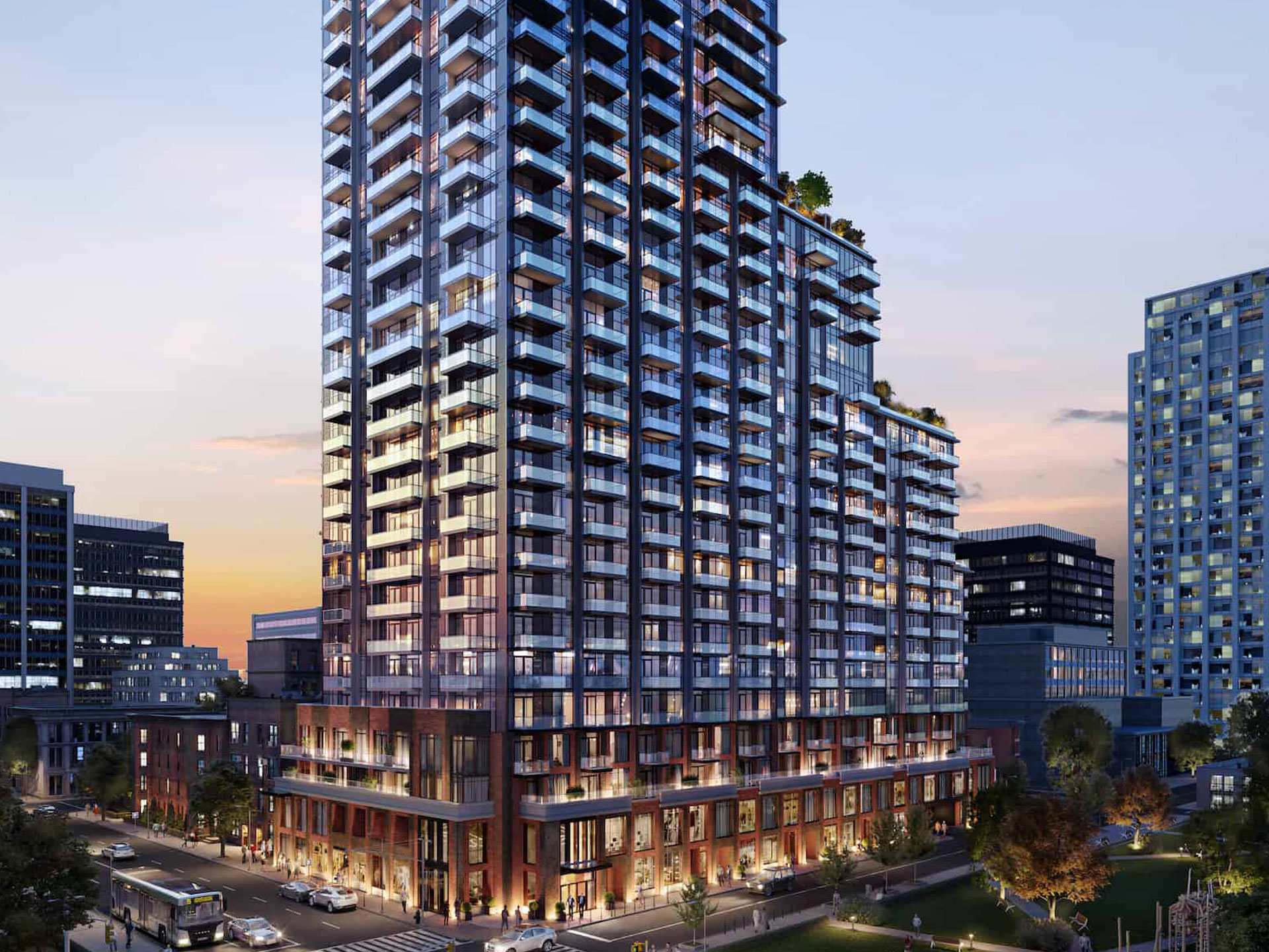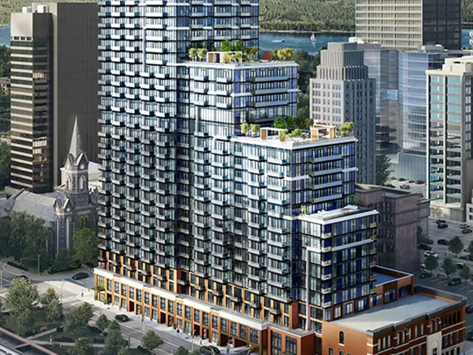The development also features rooftop amenity areas for residents atop a tiered tower massing. This project contributes to a vibrant and evolving downtown by introducing a landmark residential tower that maintains heritage continuity and activates the streetscape through purposefully integrated live-work units.