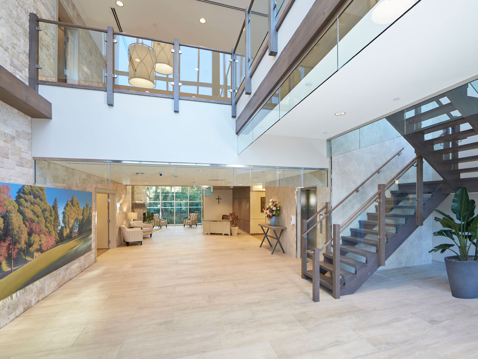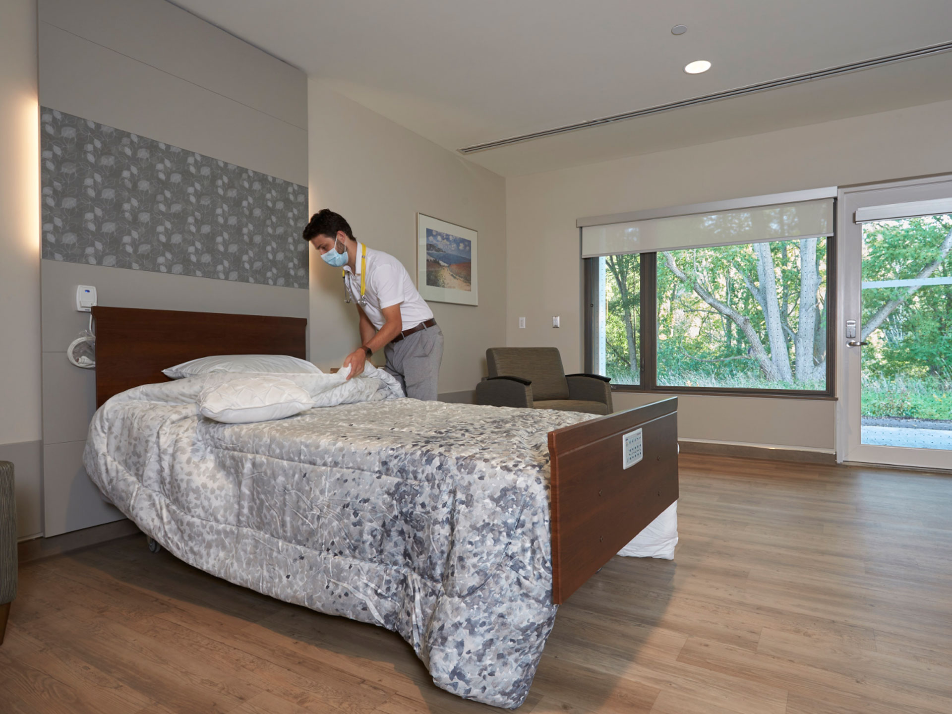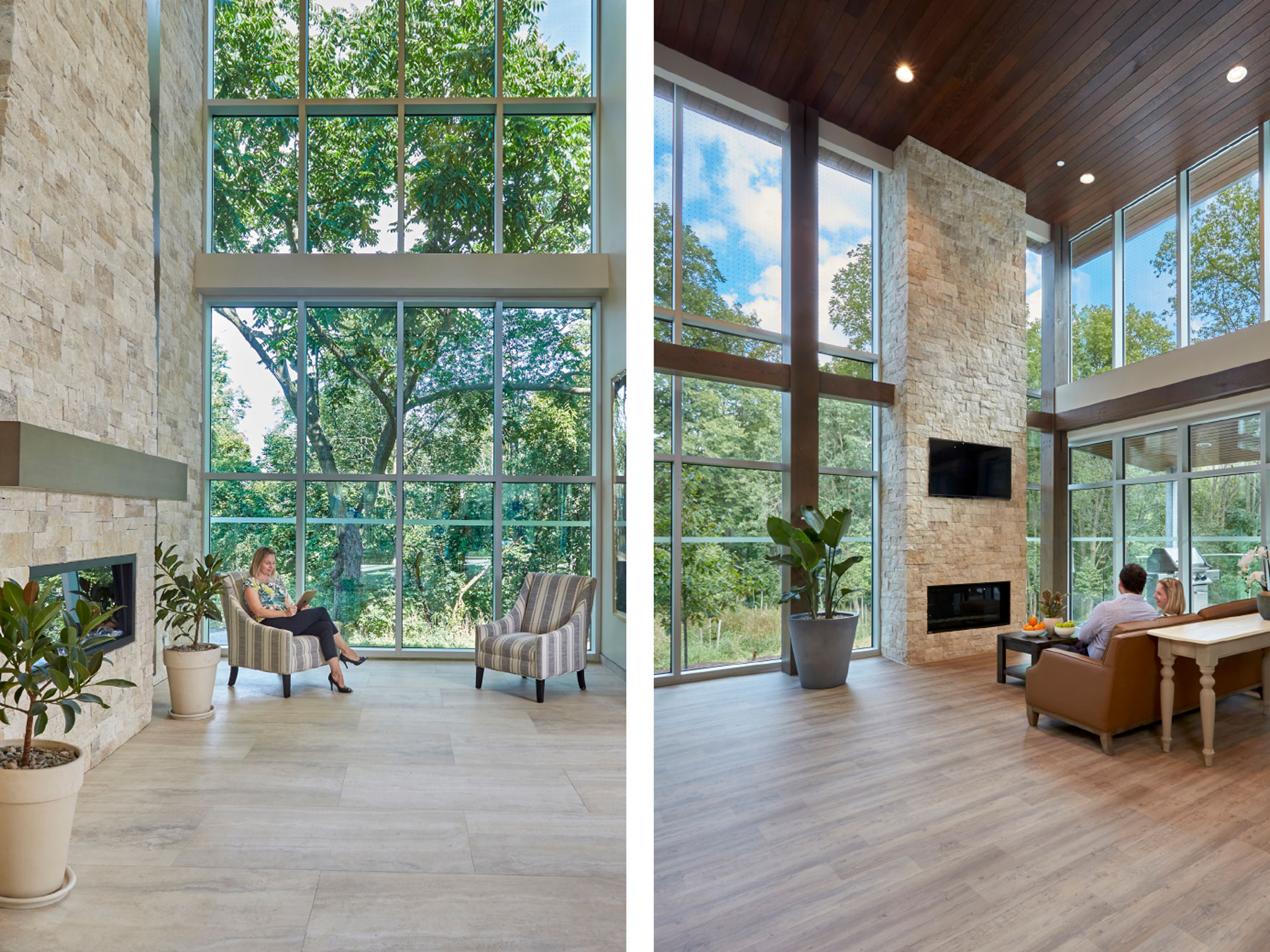 The layout of Margaret’s Place was dictated by the ravine that borders it to the South West of its site, become a large v, arranged into two central corridors with the central atrium at its heart. Resident’s rooms line one side of the halls, so that all resident rooms feature walls of windows overlooking the ravine. Each suite includes convertible chairs that turn into beds for guests who want to remain close; fireplaces and televisions; walls for family photographs, making each space personal; and a private, fully accessible en-suite. Residents can adjust their own lighting, blinds, heating, cooling, fireplaces, TV and phone from a tablet. Perhaps one of the most meaningful details, the doors in each resident suite is large enough to bring beds outside to a private enclosed patio, so no matter their ability, the residents have the opportunity to feel sun and rain, interact with the many deer and wildlife that visit the Hospice and connect with nature.