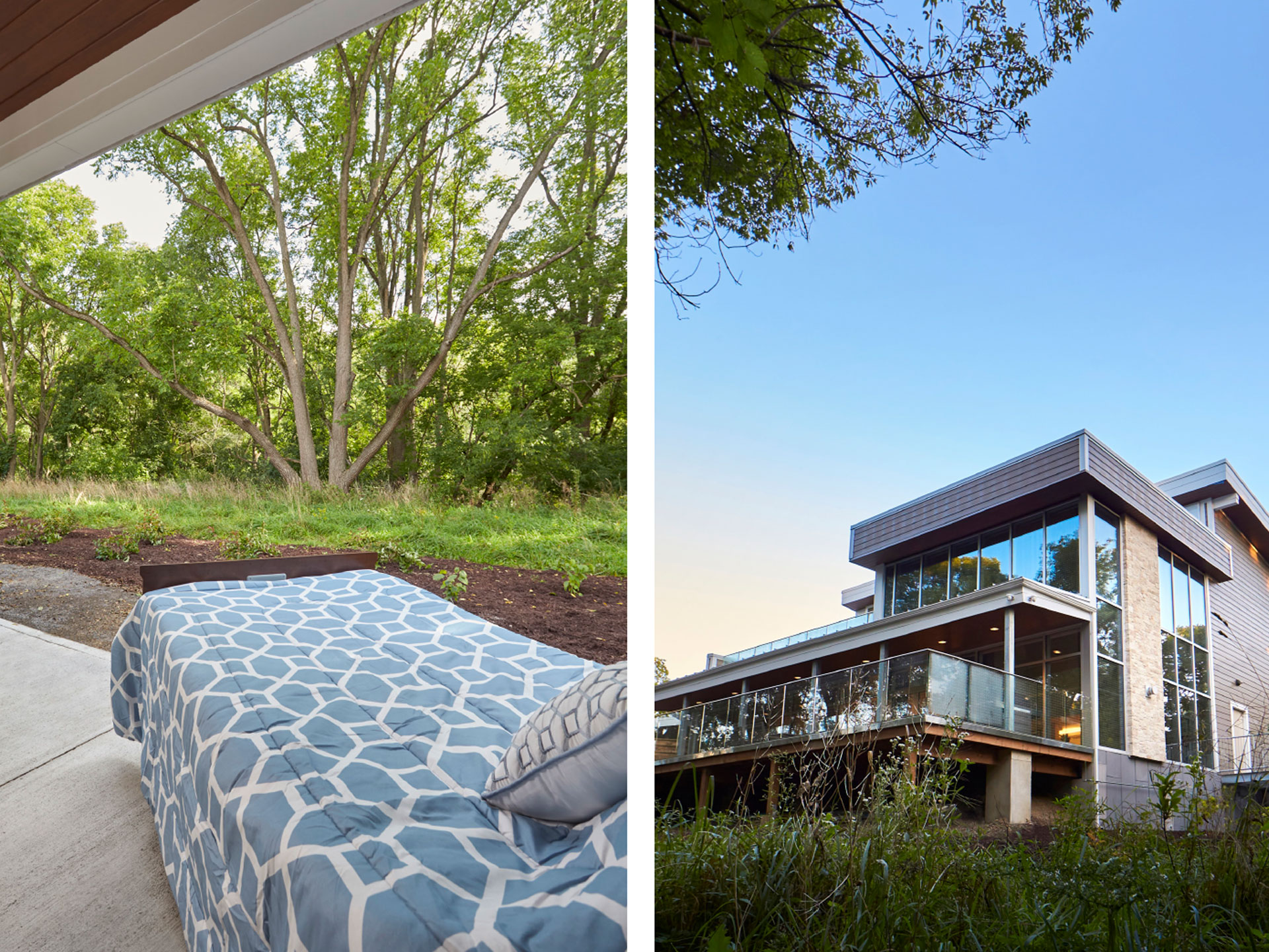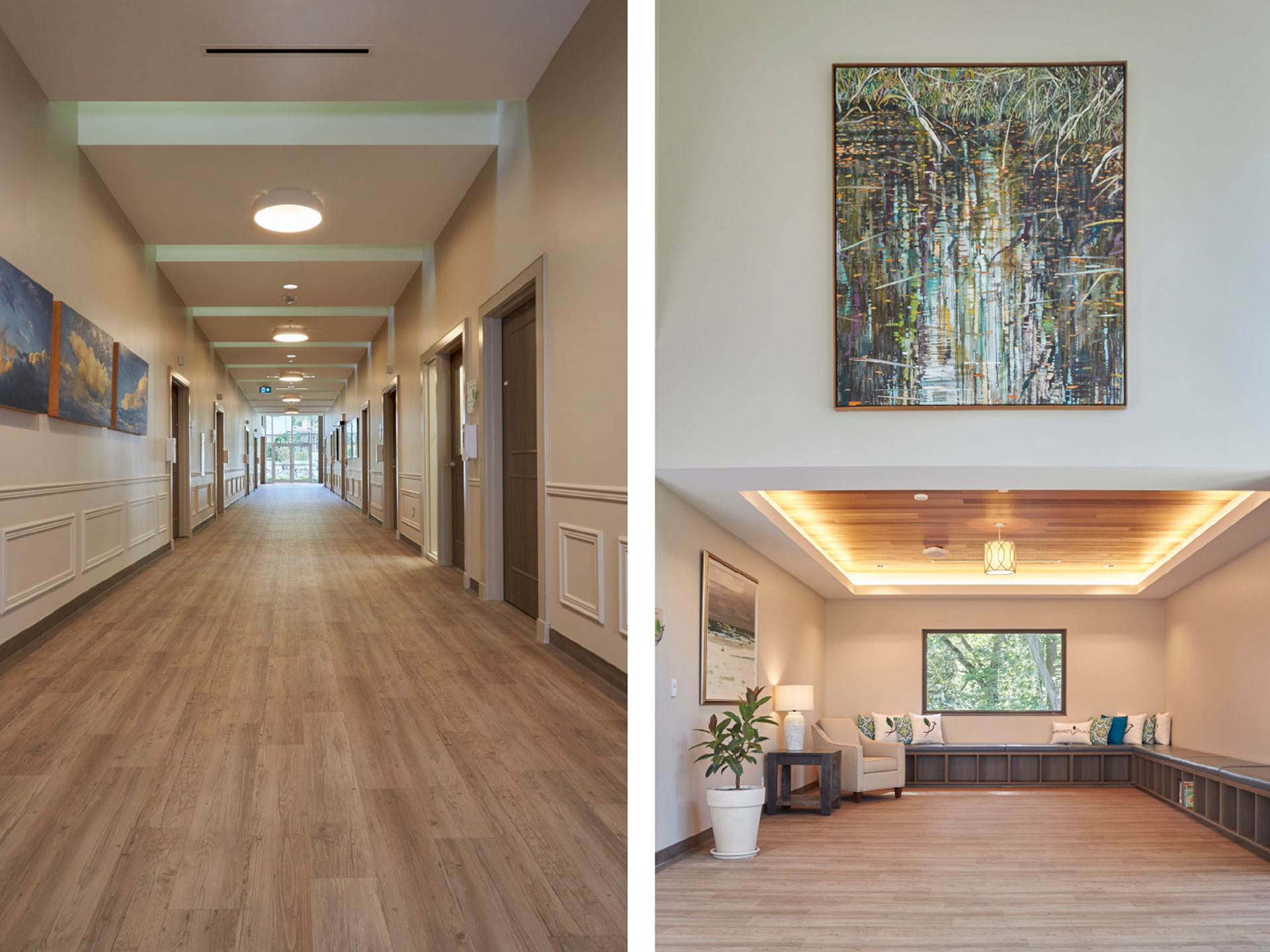 Margaret’s Place Hospice in Dundas is designed to be the antithesis of a traditional hospital, while maintaining all the infrastructure to provide excellence in care for its terminally ill residents. The 25,000 sq. ft. hospice opened in September 2021, a structure nestled on the edge of a wooded ravine, which became the inspiration for all aspects of the design. The design walked this delicate balance by connecting the hospice with its natural surroundings, paying attention to every detail that would support meaning, comfort and peace for residents, their families and caregivers. The home-like environment, one designed as inclusive and available to all, had to seamlessly blend with resident care. An innovative detail – each room has a private, covered deck, with patio doors designed larger than standard, allowing patient beds to be wheeled outside and connect with nature at all stages of their journey with the hospice.