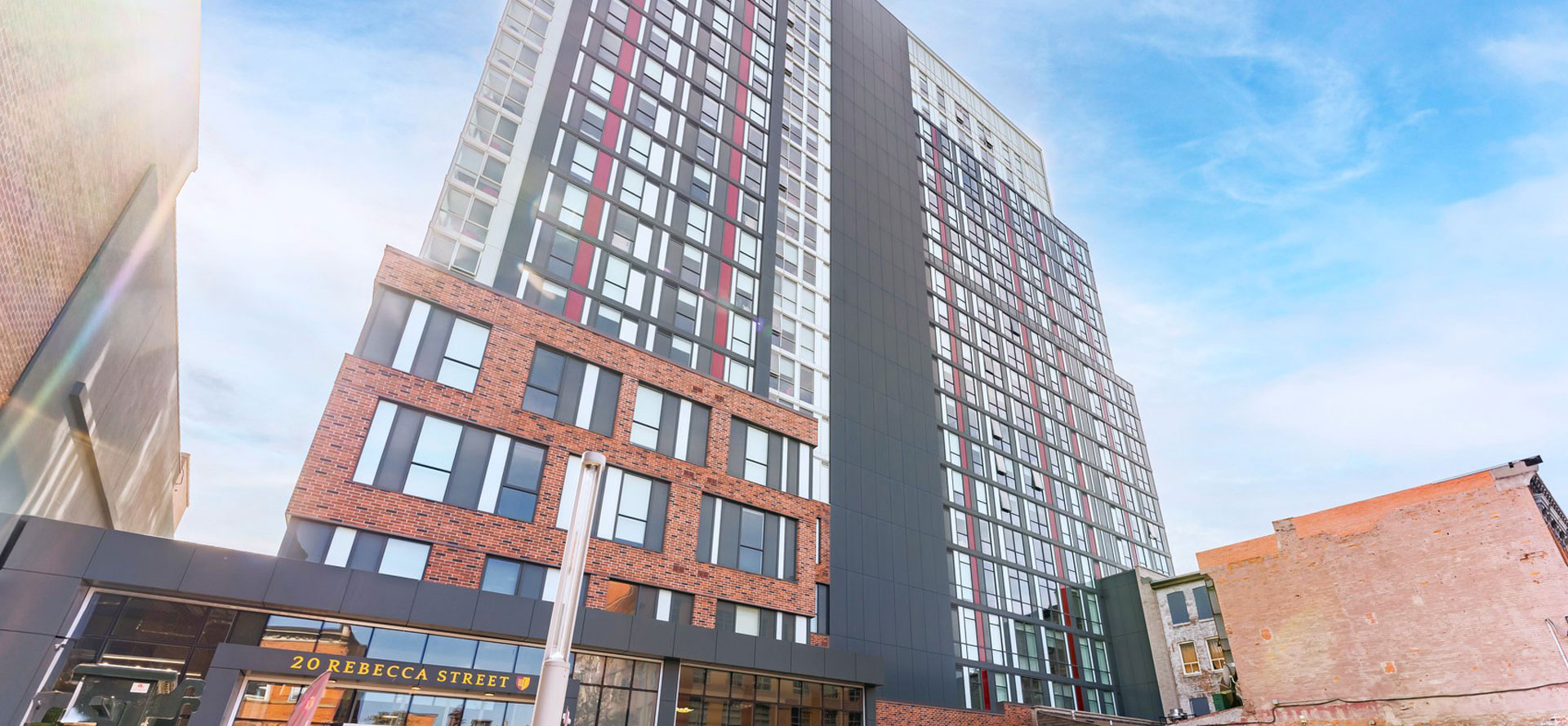 There is a plaza off Rebecca Street that has been landscaped with lighting, planter boxes and street furniture to animate the area and provide common amenity space for residents.