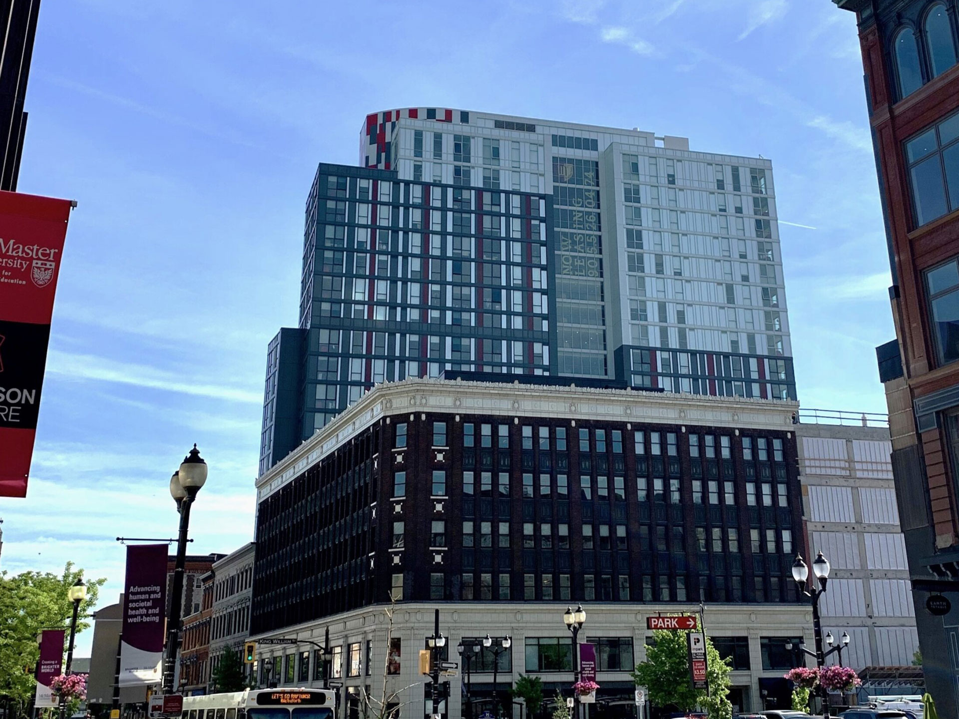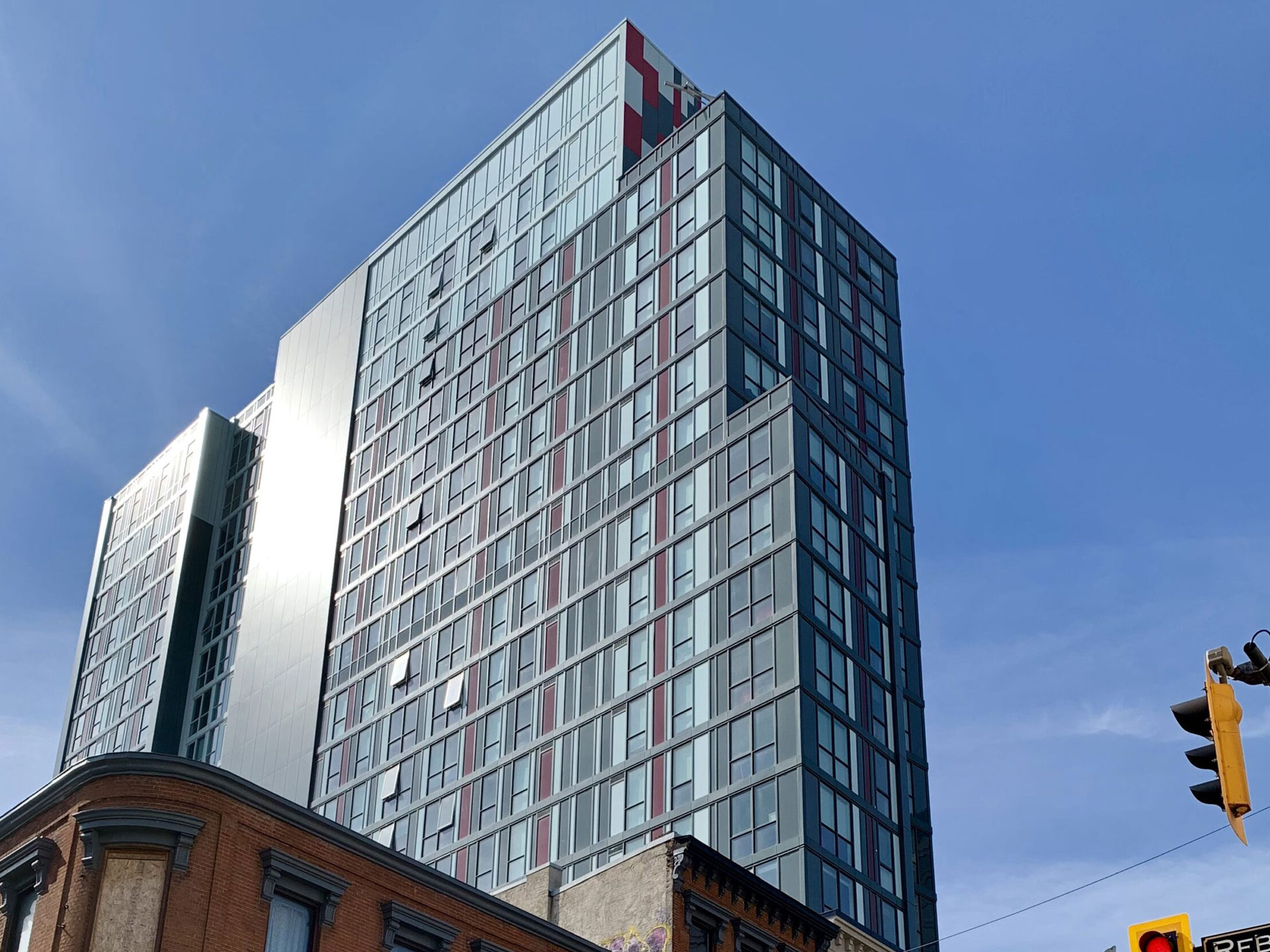 This project involved the redevelopment of the former William Thomas building, built in 1855, into a purpose built student housing development in the historic core of Hamilton. The design provides for a 21 storey tower with a podium on James Street and a plaza area facing Rebecca Street. The completed project has 159 residential units in the tower, and retail storefronts and residential common areas within the podium. The podium is the recreation of the William Thomas Building which provides for the historic continuation of the streetscape as it has existed since the construction of the Lister Block in the 1920’s. The project maintains the character of the historic core by utilizing the former heritage façade, while the modern residential tower is set back from the podium and treated with a combination of glass, limestone, metal and brick to create a dialogue between the old and new.